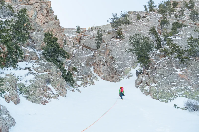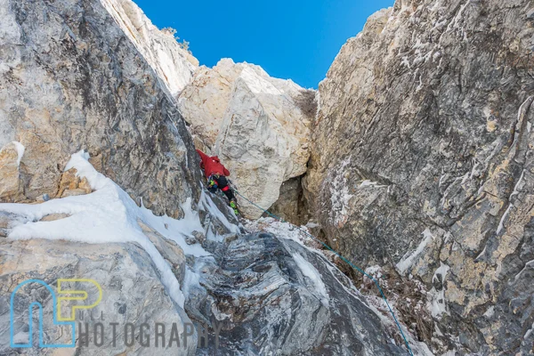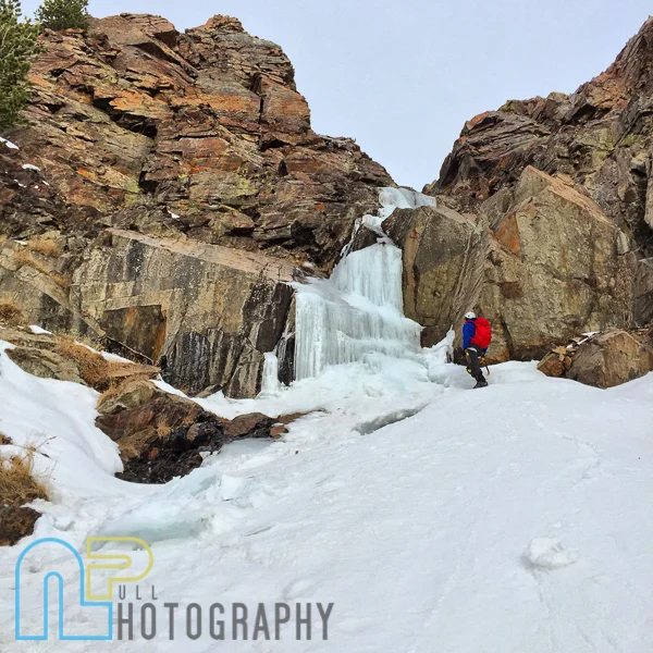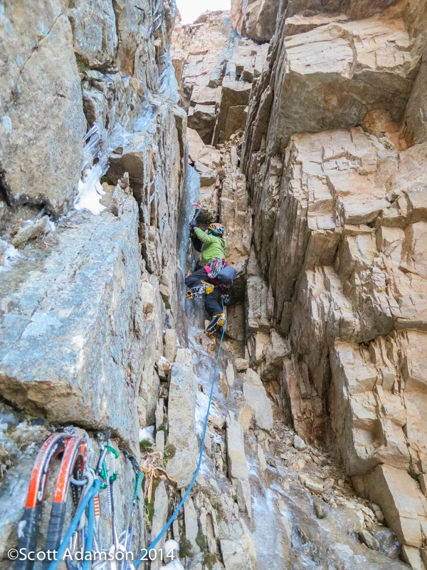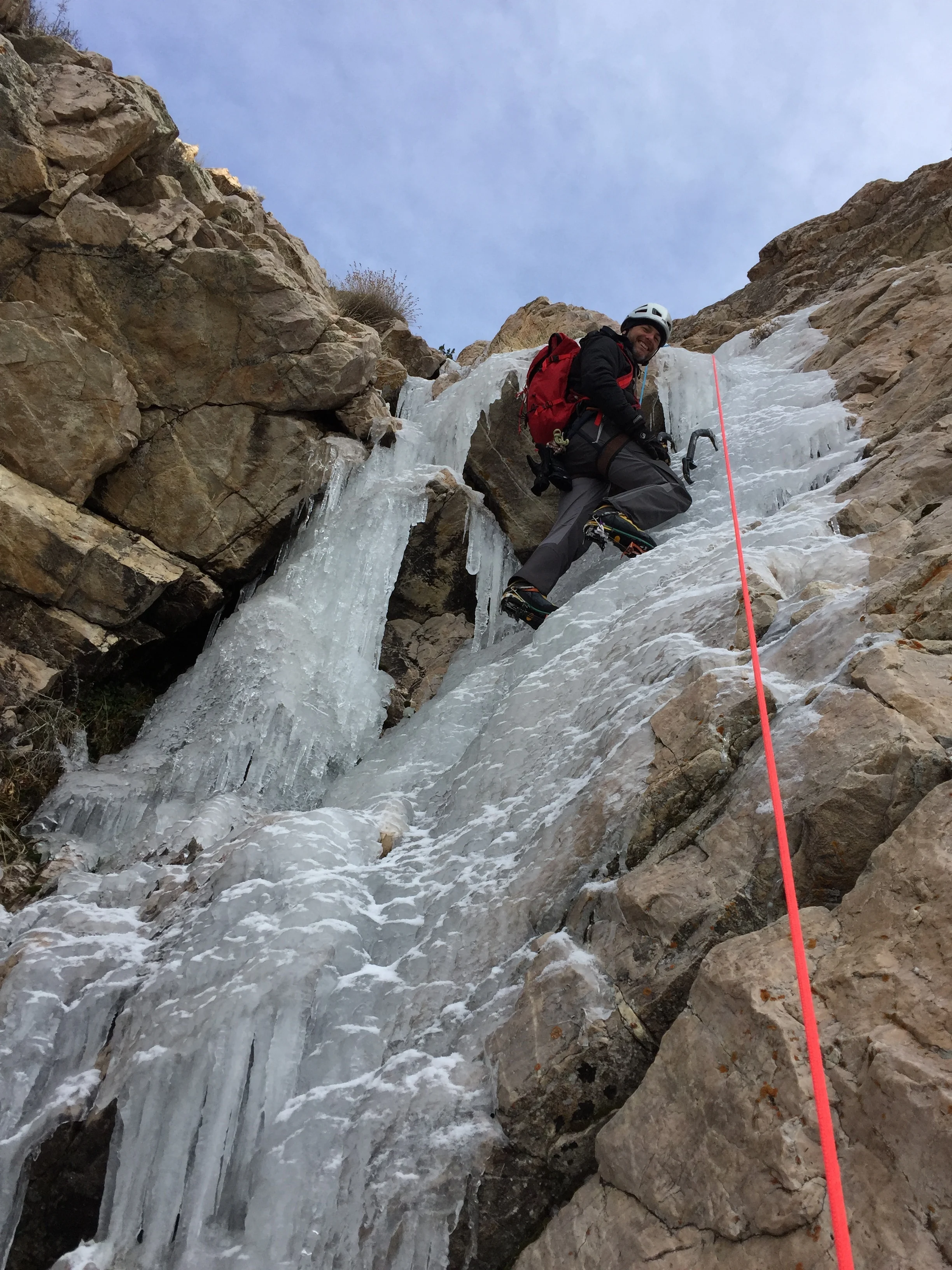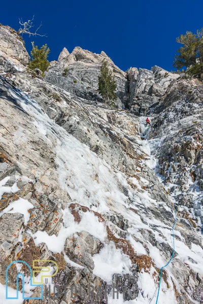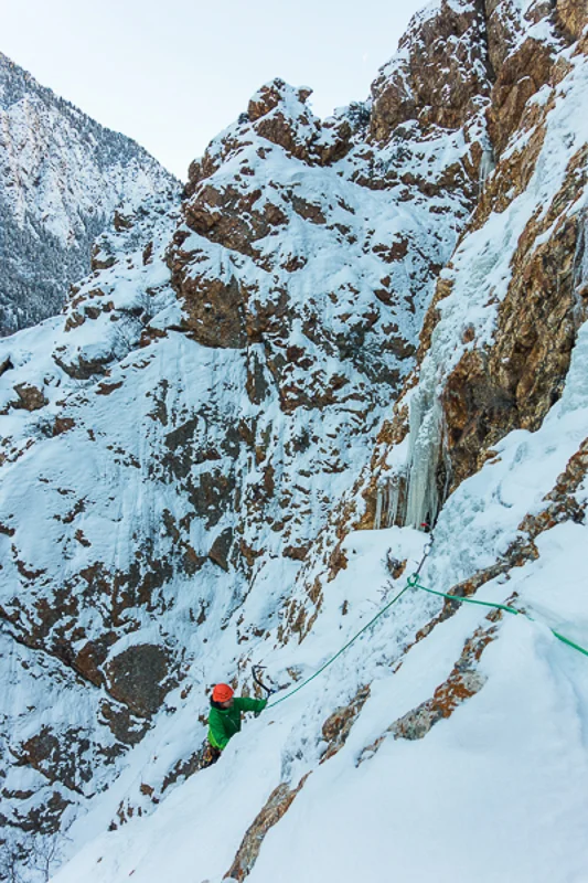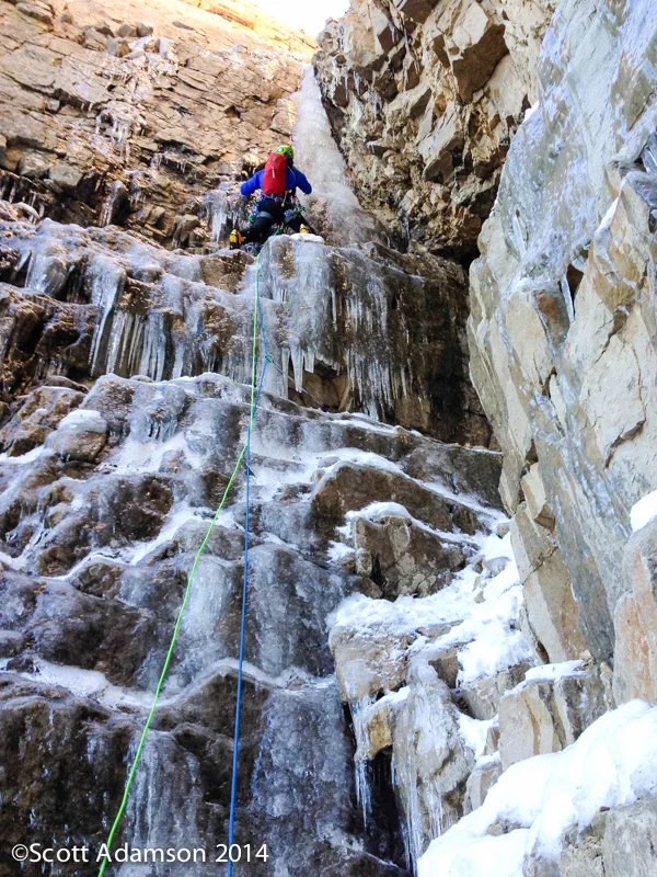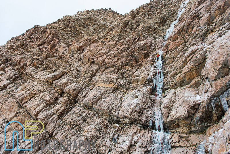 Pitch 5 was a low angle gully. Starting narrow, just more than body-width, the gully opened up wider after 40' to rambling ice steps. I made the belay at 150' and brought Julien up. From here, the ice continues but looked like it did not go far. Wanting to check it out, I solo'd 200+' of WI2 until it ended in tallus above.