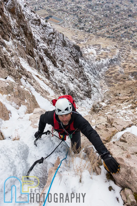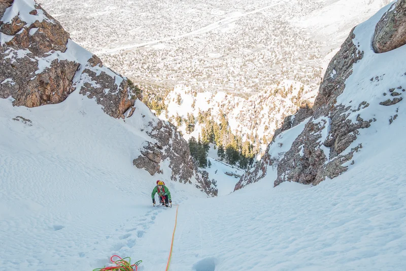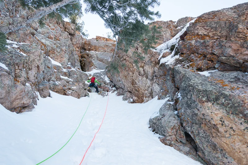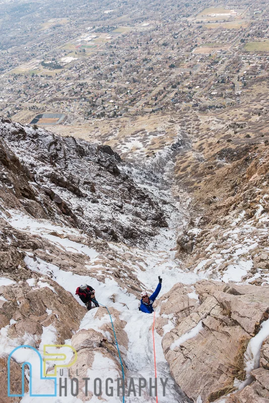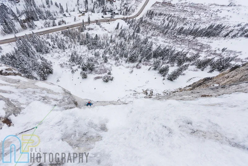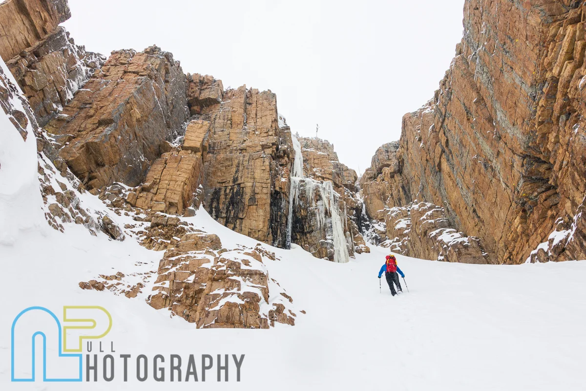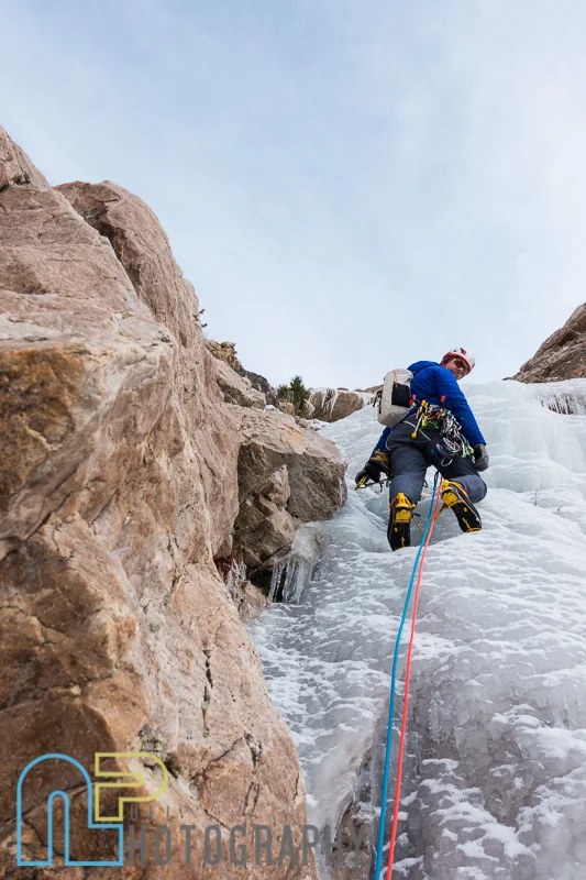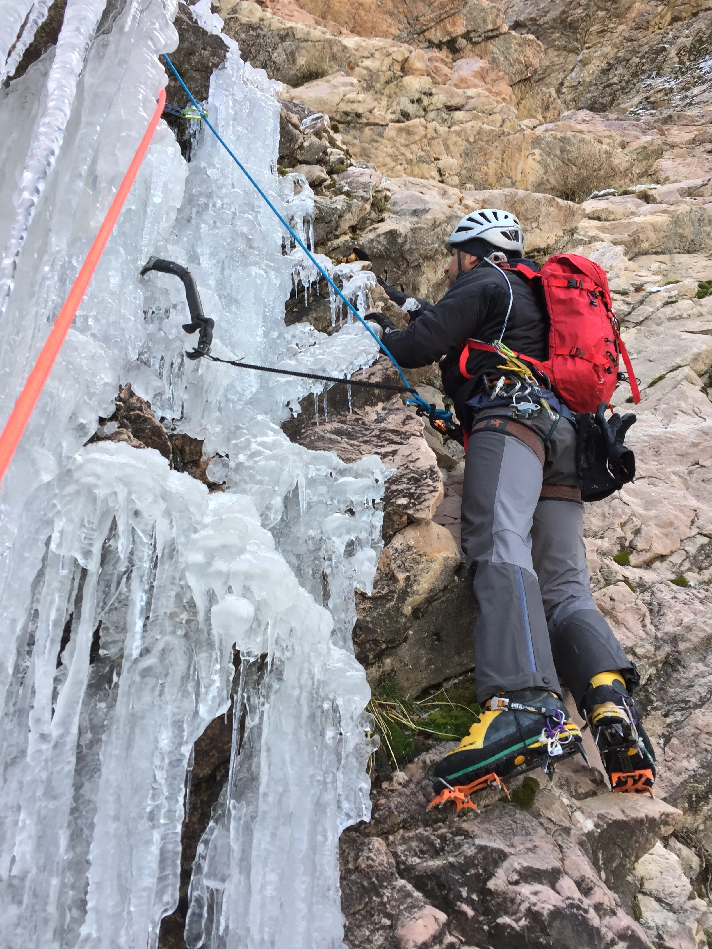 Pitch 5 was a low angle gully. Starting narrow, just more than body-width, the gully opened up wider after 40' to rambling ice steps. I made the belay at 150' and brought Julien up. From here, the ice continues but looked like it did not go far. Wanting to check it out, I solo'd 200+' of WI2 until it ended in tallus above.