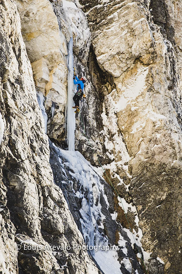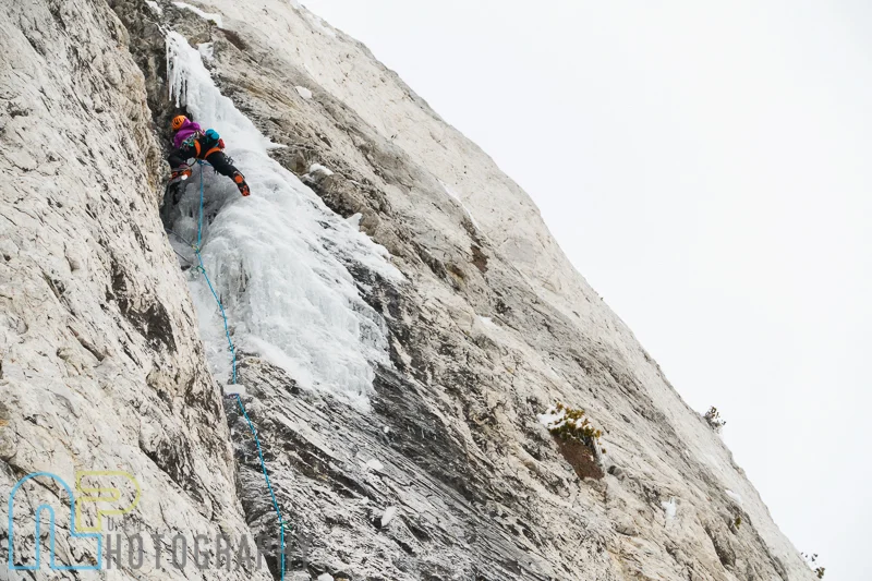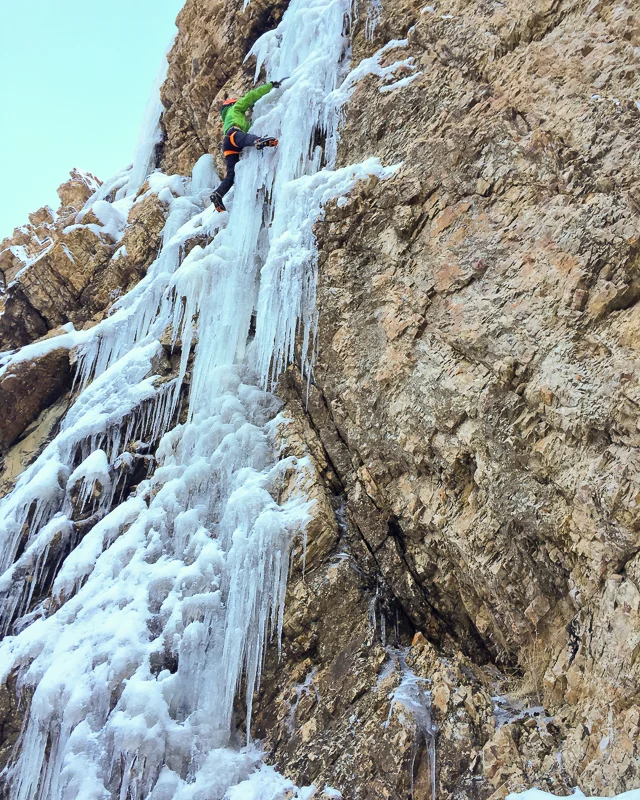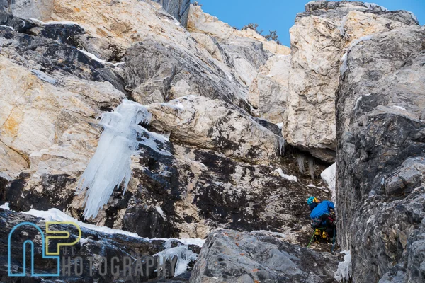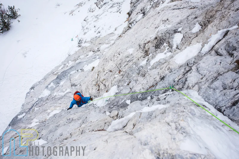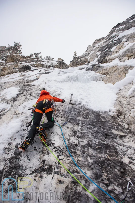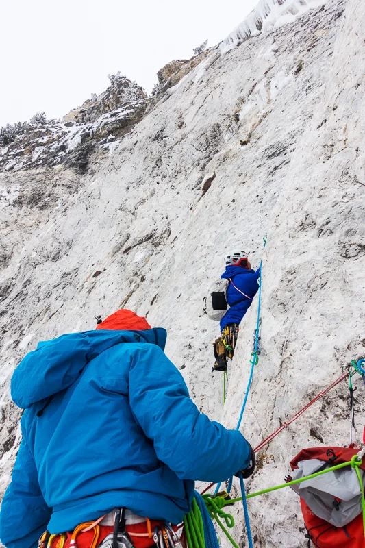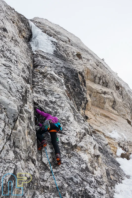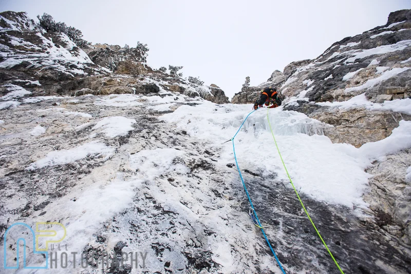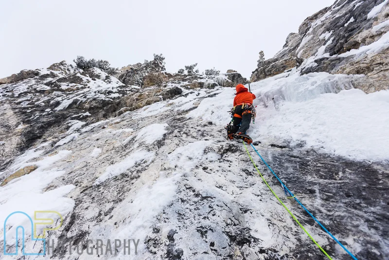 A few days later Julien and I were hiking in the pre-dawn. Perfect temps and conditions and low snow on the approach made for fast hiking and we were at the base in a little more than an hour. I took the first pitch, 45' of almost vertical ice with a short M4 topout led to a traversing shelf heading right. Julien took pitch two, a full ropelength of WI3-. Pitch 3 was more WI3 to a snowfield and outcrop for the belay.