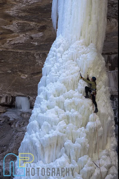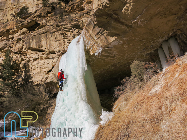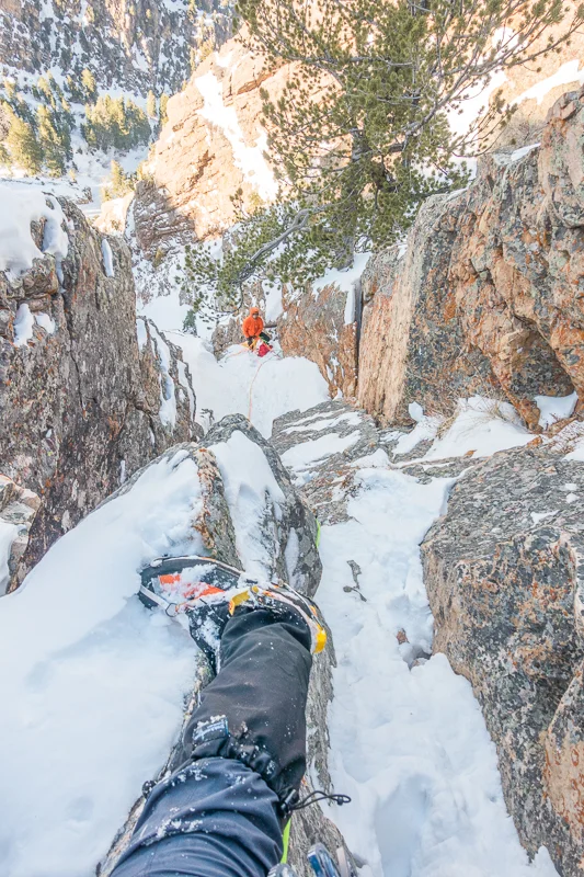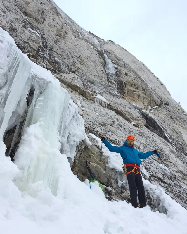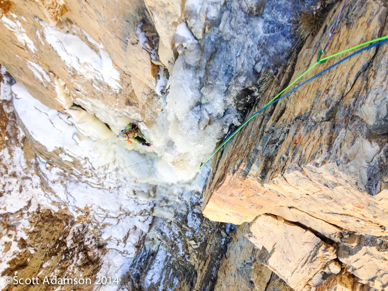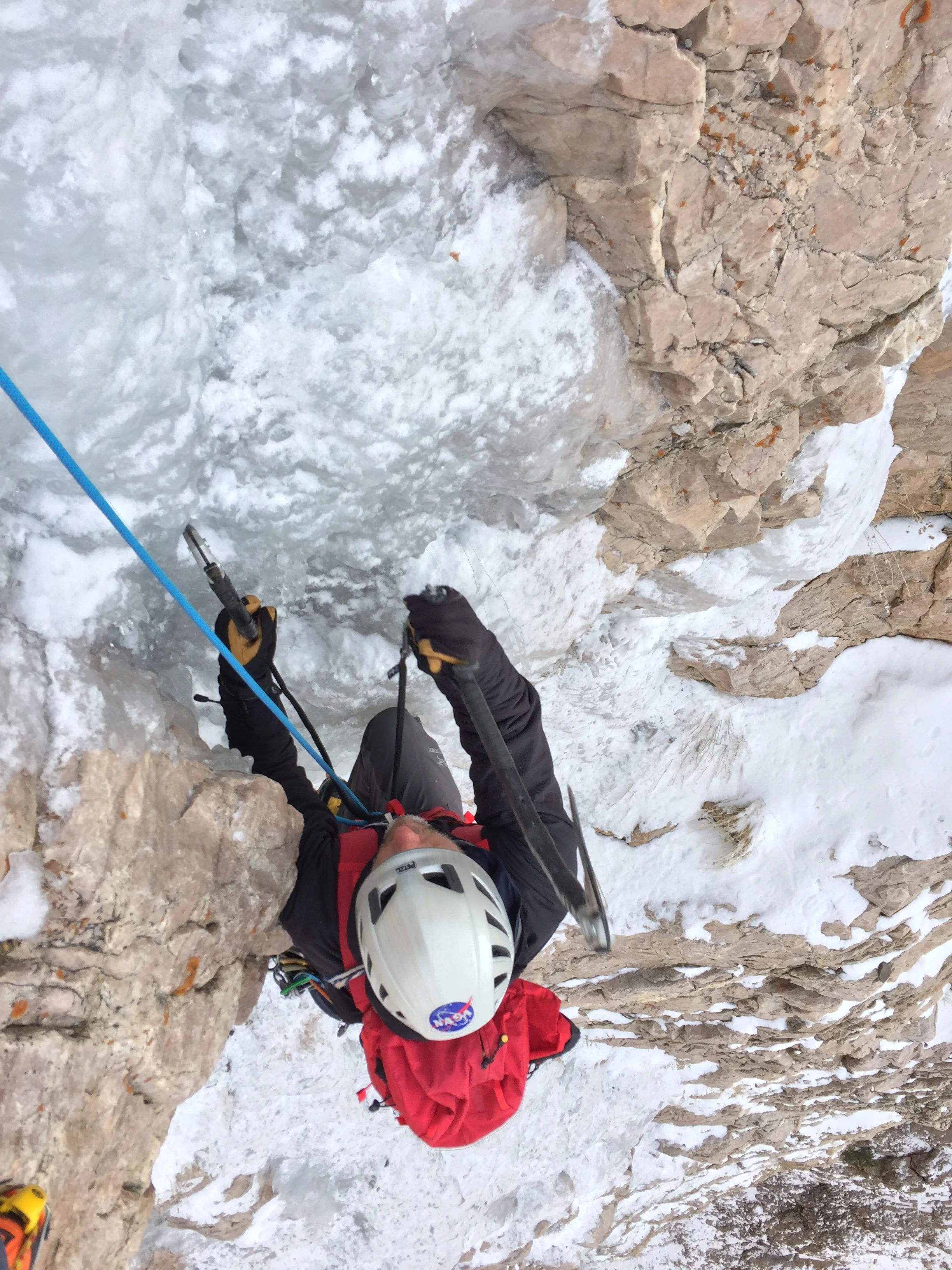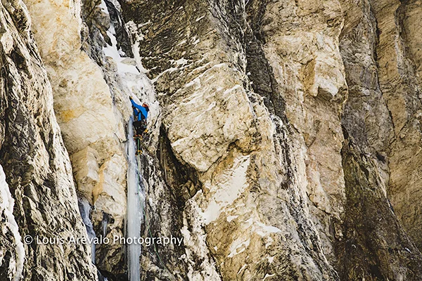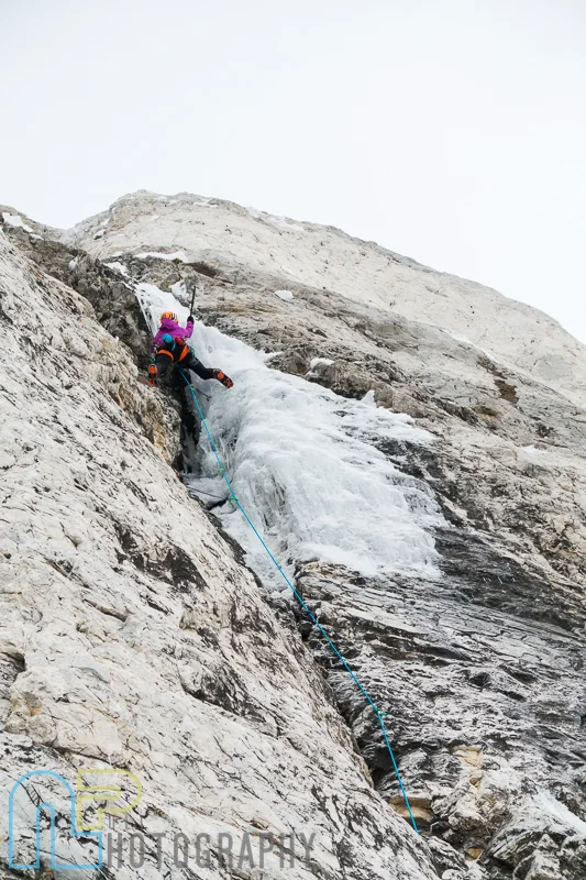 A few days later Julien and I were hiking in the pre-dawn. Perfect temps and conditions and low snow on the approach made for fast hiking and we were at the base in a little more than an hour. I took the first pitch, 45' of almost vertical ice with a short M4 topout led to a traversing shelf heading right. Julien took pitch two, a full ropelength of WI3-. Pitch 3 was more WI3 to a snowfield and outcrop for the belay.
