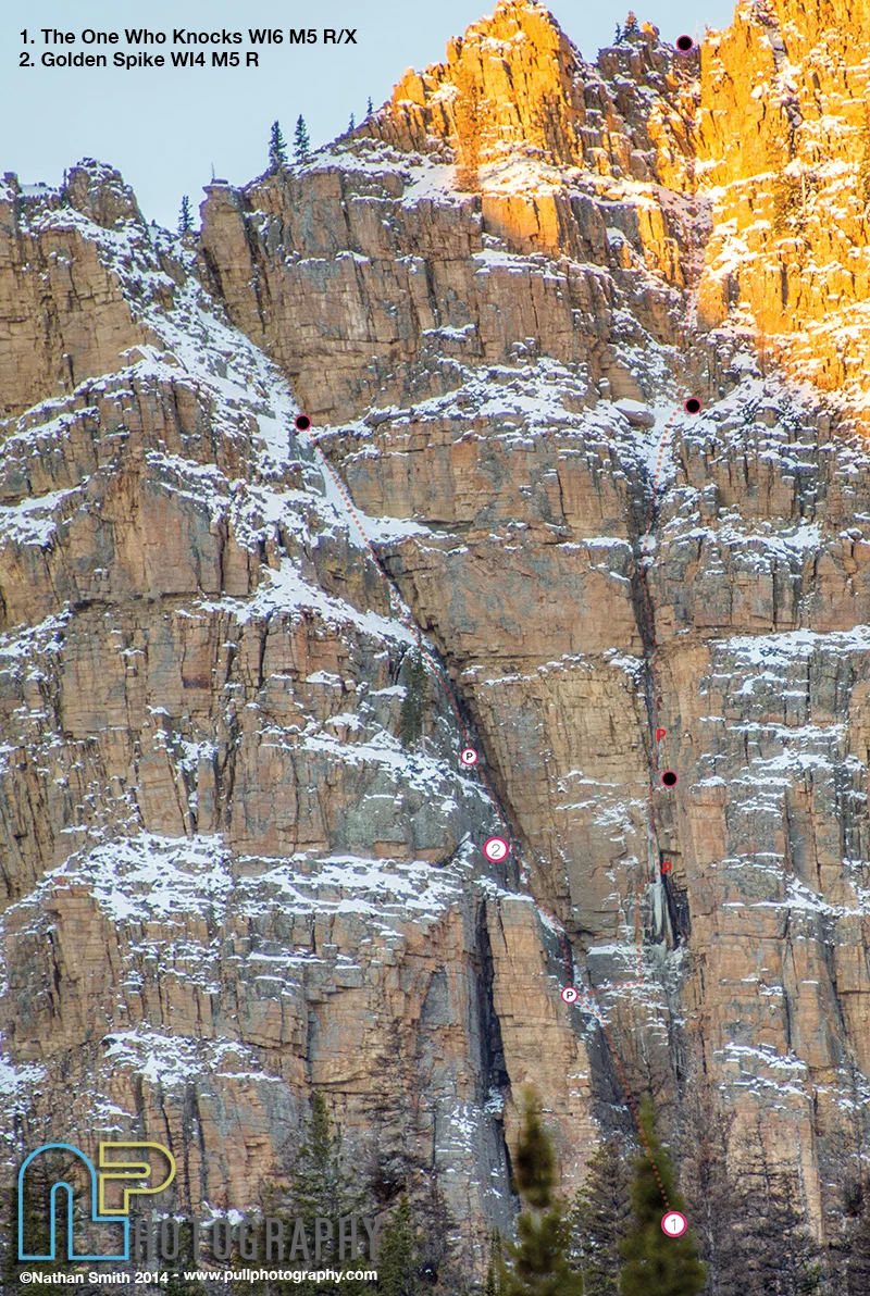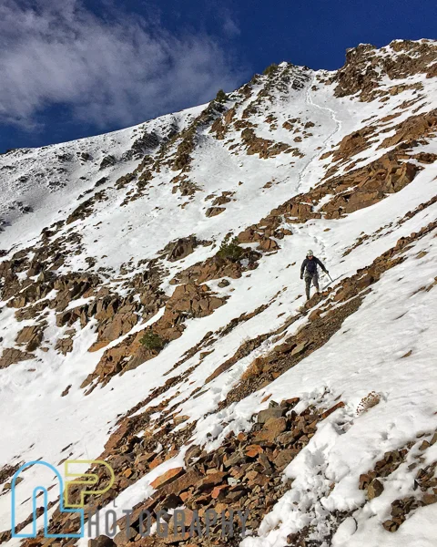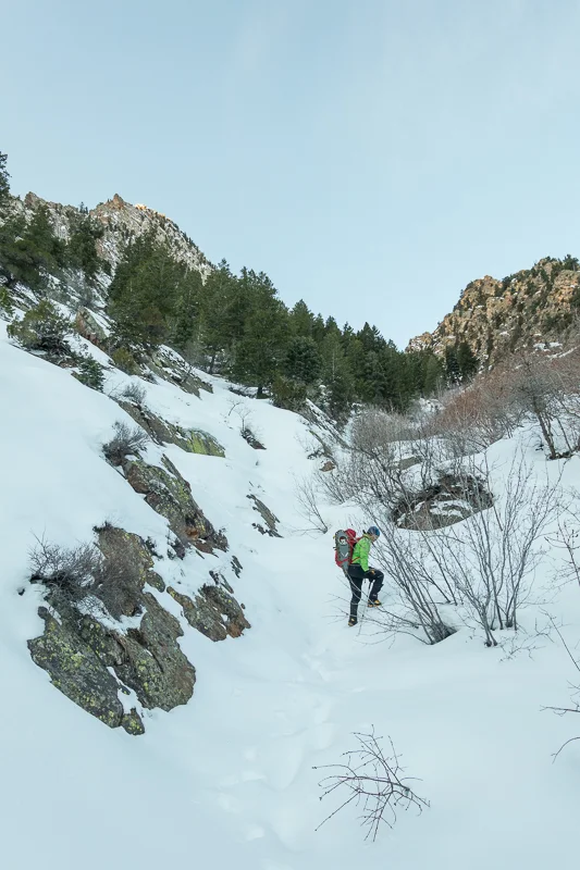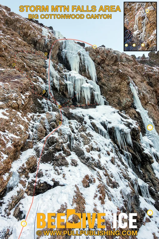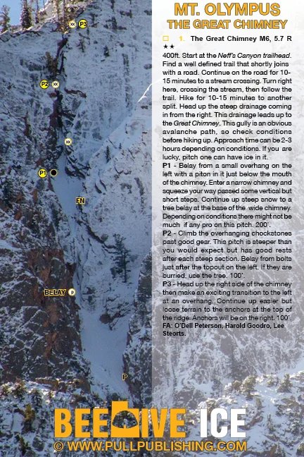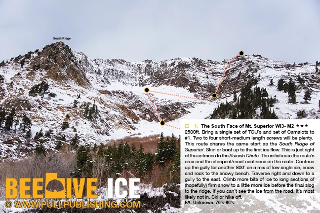 Park at the Highline Trailhead and follow the summer trail to the Iron Hayden Wall or follow the directions from Beehive Ice to Stymingers Fink. Once at treeline, follow the edge of the trees and talus, avoiding the largest talus patches. The route is at the far left end of Hayden Peak. Expect 1-1.5 hours.