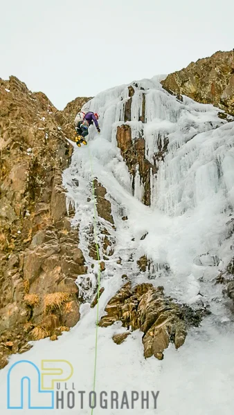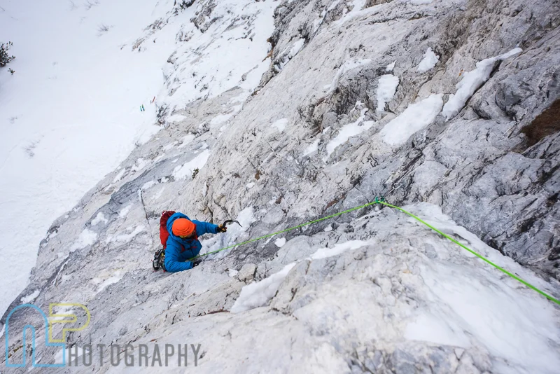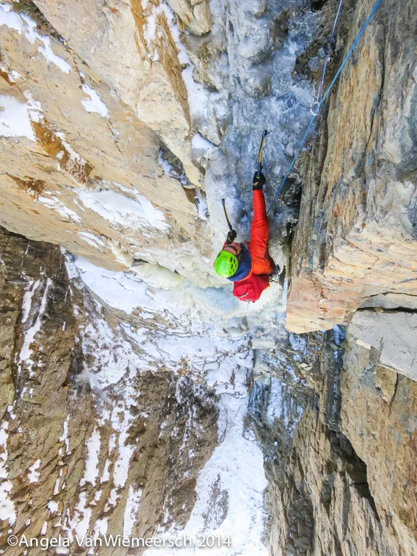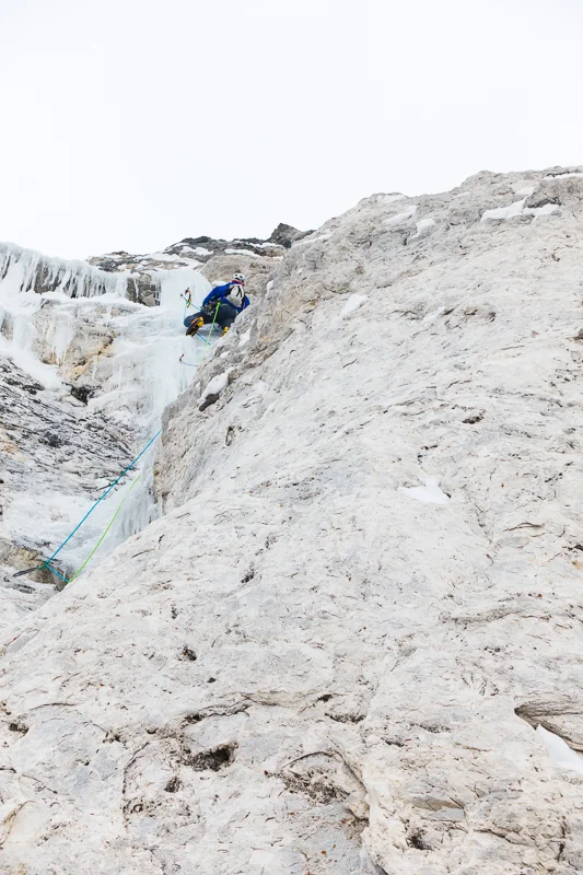 Julien Baudrand on the traverse above the ice on pitch 1.