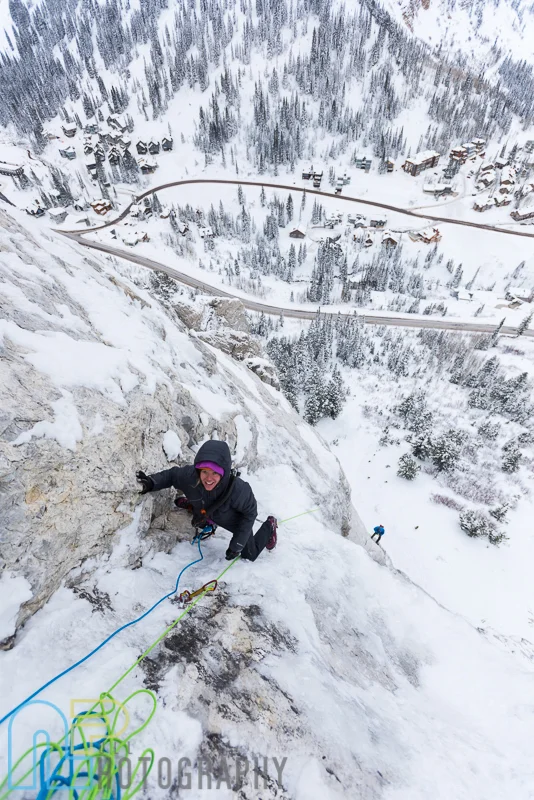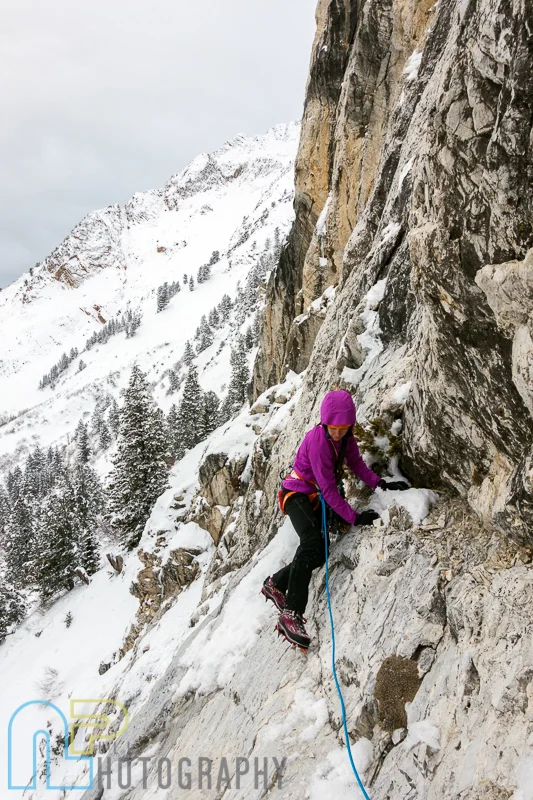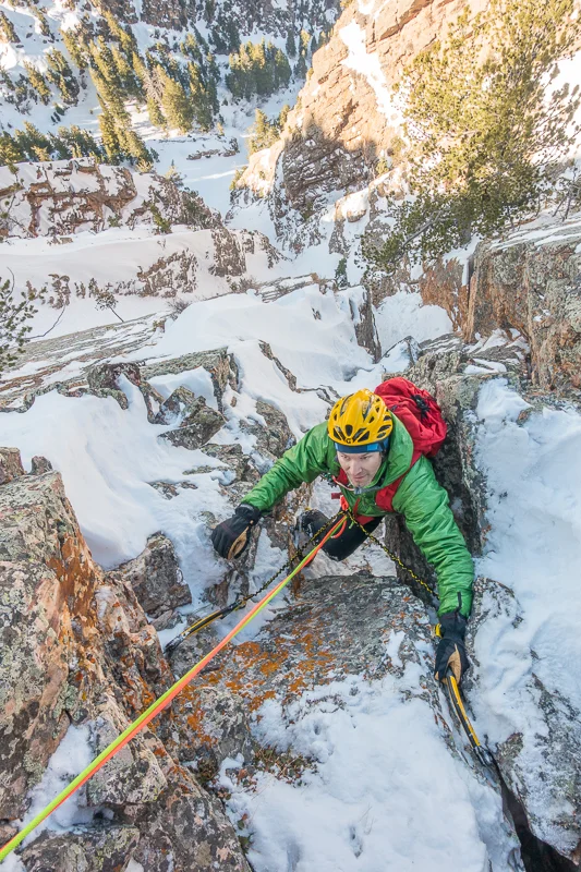 We traversed left from here to reach an icy smear in a corner. Thin ice pretected every few feet by bomber gear in the quartzite. 35' of M4 lead to a snowfield and a tree belay 160' above me.