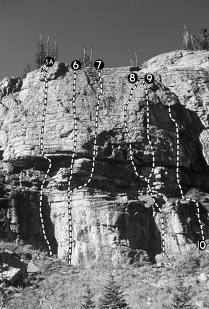 75 feet. A fun roof leads to easier climbing above. 8 bolts plus anchors.